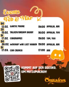 - Unsere Events im Februar und MärzHeyooo liebe Onis! Wir haben jetzt einen vorläufigen Eventplan für Februar und März. Die Events werden… Unsere Events im Februar und März weiterlesen